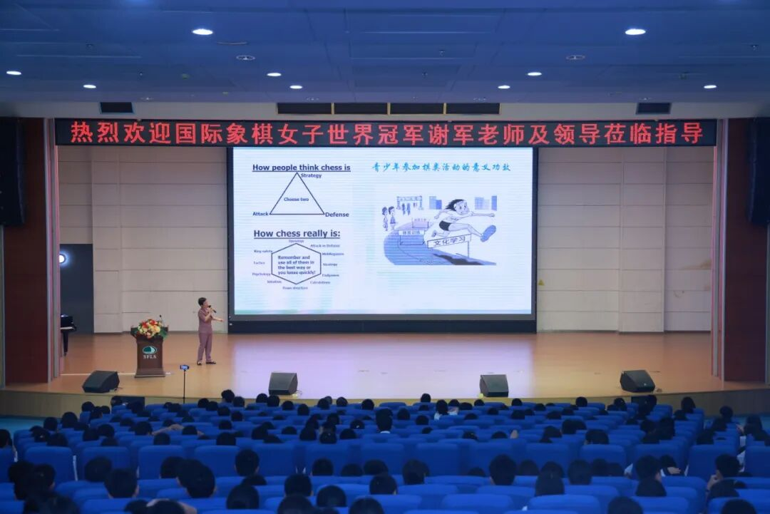 近日,国际象棋棋后、世界冠军谢军走进深圳外国语学校(集团)初中部,为师生带来了一场题为“黑白64格里的世界”的精彩讲座,在校园中掀起一阵“国际象棋热”。
