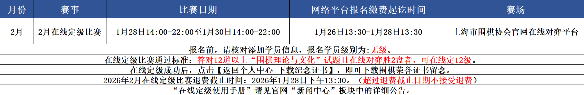 2026年2月上海市业余围棋在线定级赛赛事报名公告