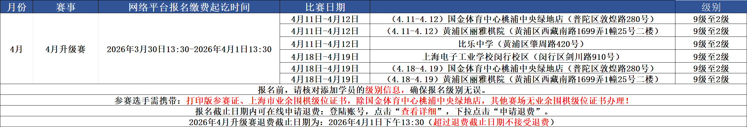 “扑扑鲸杯”2026年4月上海市业余围棋升级赛赛事报名公告