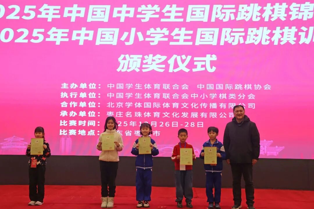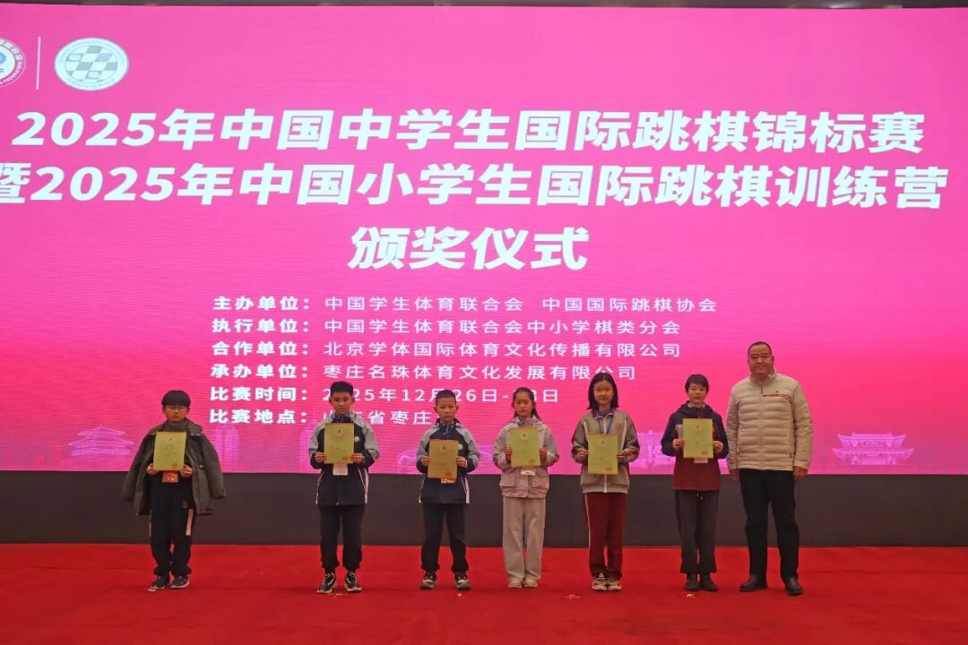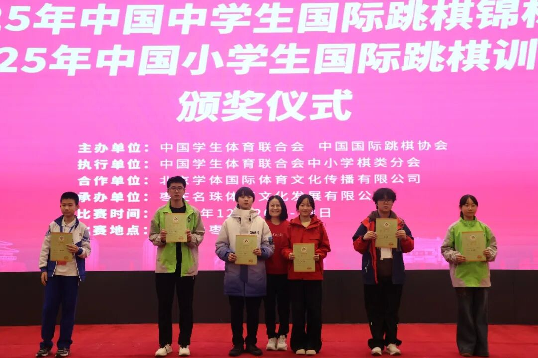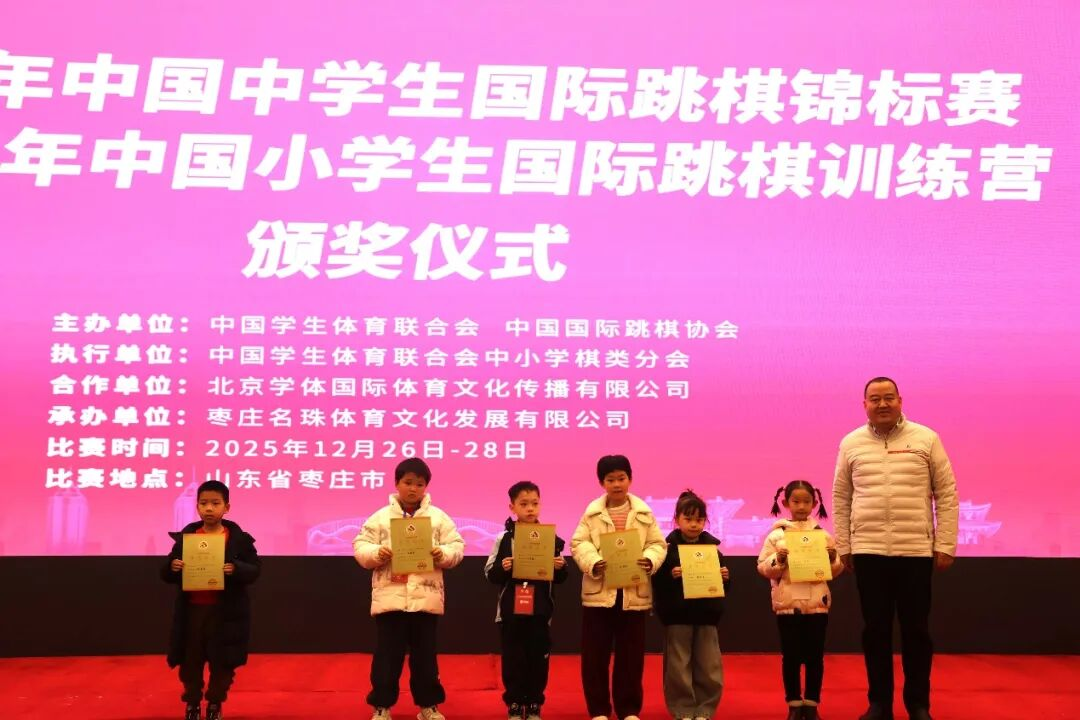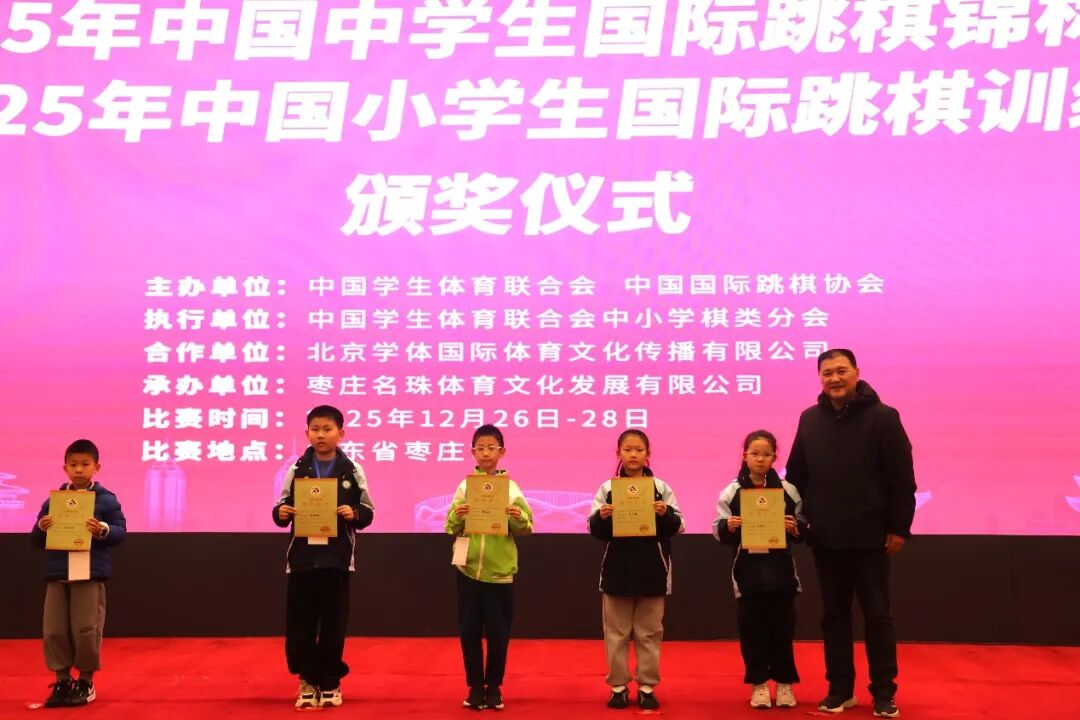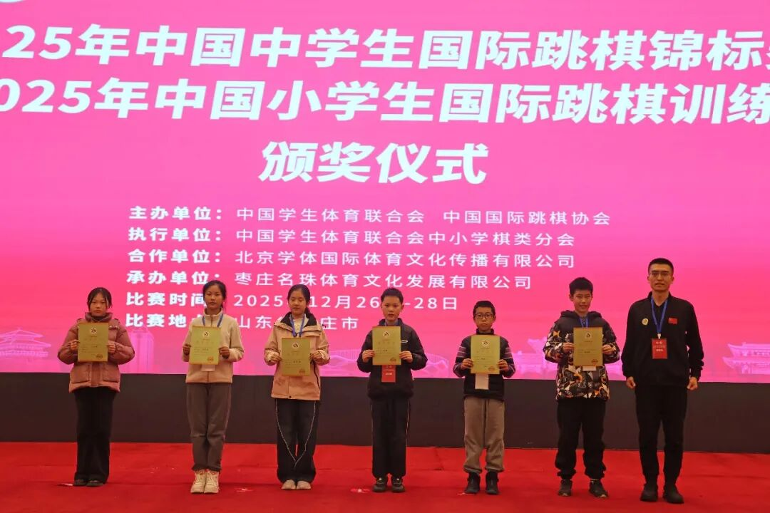 经过三天的激烈角逐,2025 年 12 月 28 日,2025 年中国中学生国际跳棋锦标赛暨中国小学生国际跳棋训练营在山东枣庄开元凤鸣山庄落下帷幕。本次赛事设置 64 格和 100 格男、女个人赛,分中学组、小学甲组、小学乙组、小学丙组四个年级竞赛组别,同时依据个人成绩计算团体总分奖,吸引了来自全国 15 个省区市、107 所学校的近 300 名青少年国际跳棋爱好者同台竞技,在棋盘上展现智慧与风采。