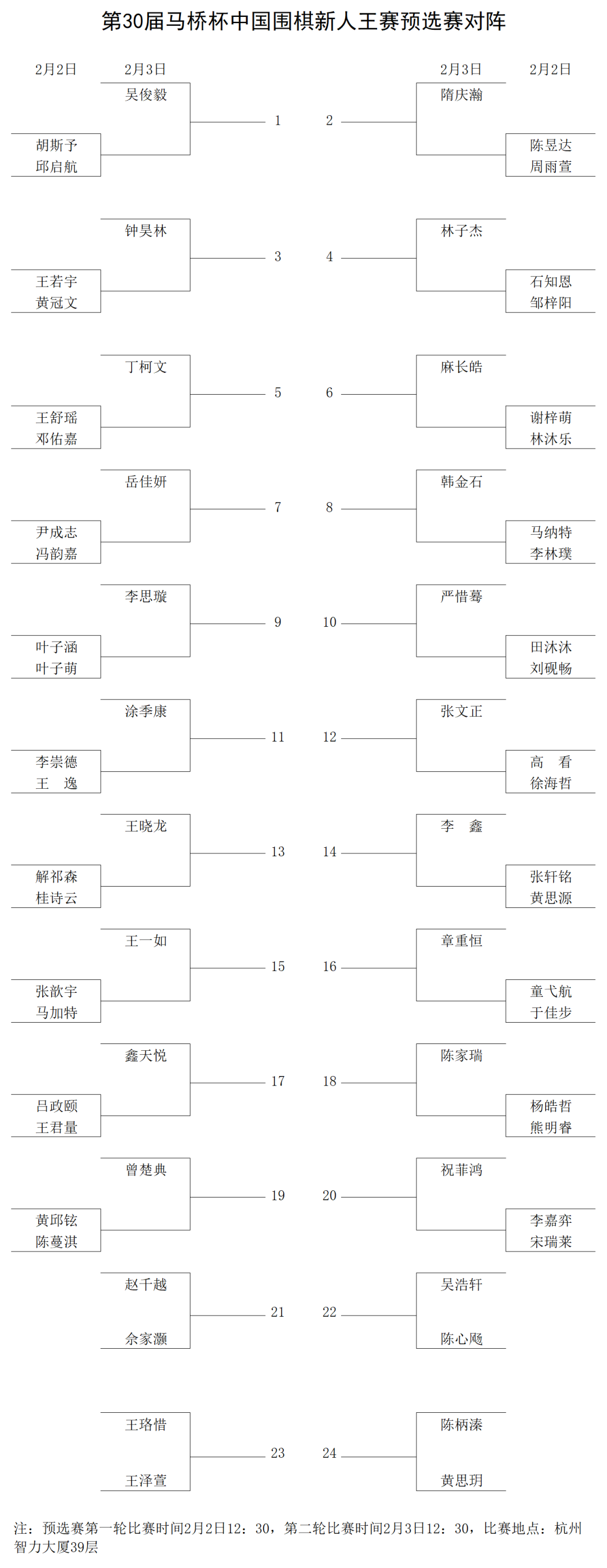 30届马桥杯中国围棋新人王赛预选赛将于2026年2月2、3日在浙江杭州智力大厦进行,详细对阵见下。