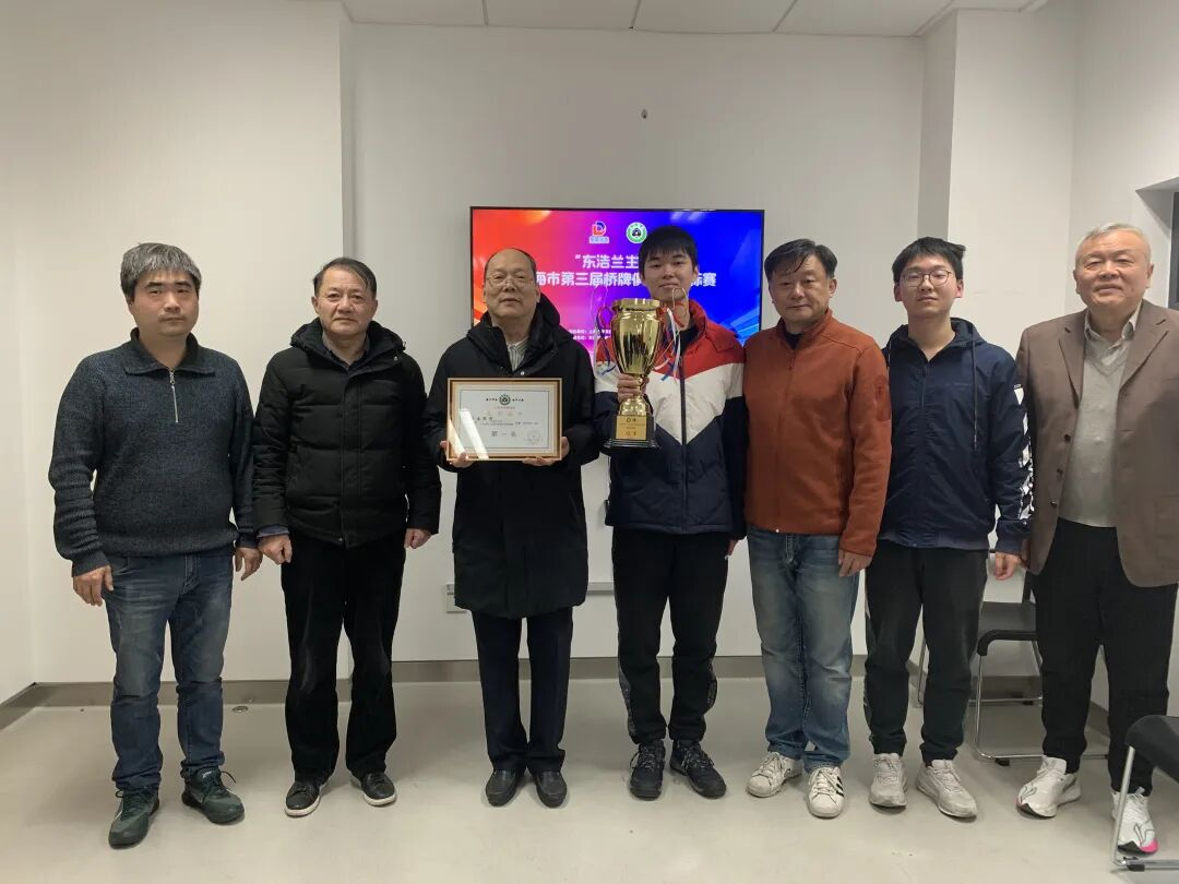 一场持续时间近一个月的“东浩兰生杯”上海市第三届桥牌俱乐部锦标赛1月24日下午在上海棋牌院圆满结束,拥有傅学明、林子苏、李嘉军、邓志毅、沈仪宁、程闻裔的华建集团队荣获男子团体冠军,上海地平线队(利之源)位居亚军,普陀桥协队(国金体育)、上海东汽队排列第三、第四名。比赛结束后,上海市桥牌协会会长戴柳为获奖队伍颁发奖杯、奖状、奖金。